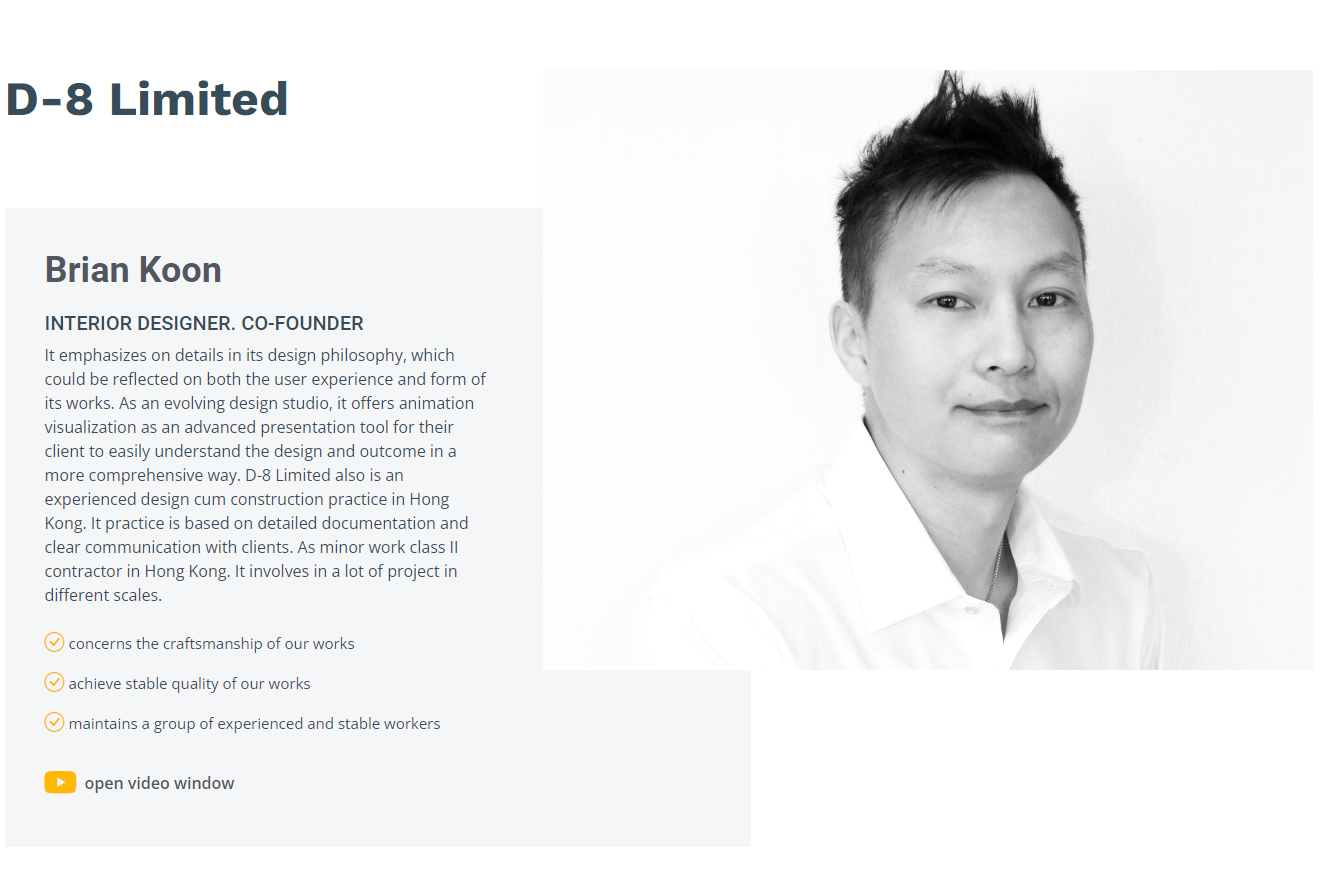 It emphasizes on details in its design philosophy, which could be reflected on both the user experience and form of its works. As an evolving design studio, it offers animation visualization as an advanced presentation tool for their client to easily understand the design and outcome in a more comprehensive way. D-8 Limited also is an experienced design cum construction practice in Hong Kong. It practice is based on detailed documentation and clear communication with clients. As minor work class II contractor in Hong Kong. It involves in a lot of project in different scales.